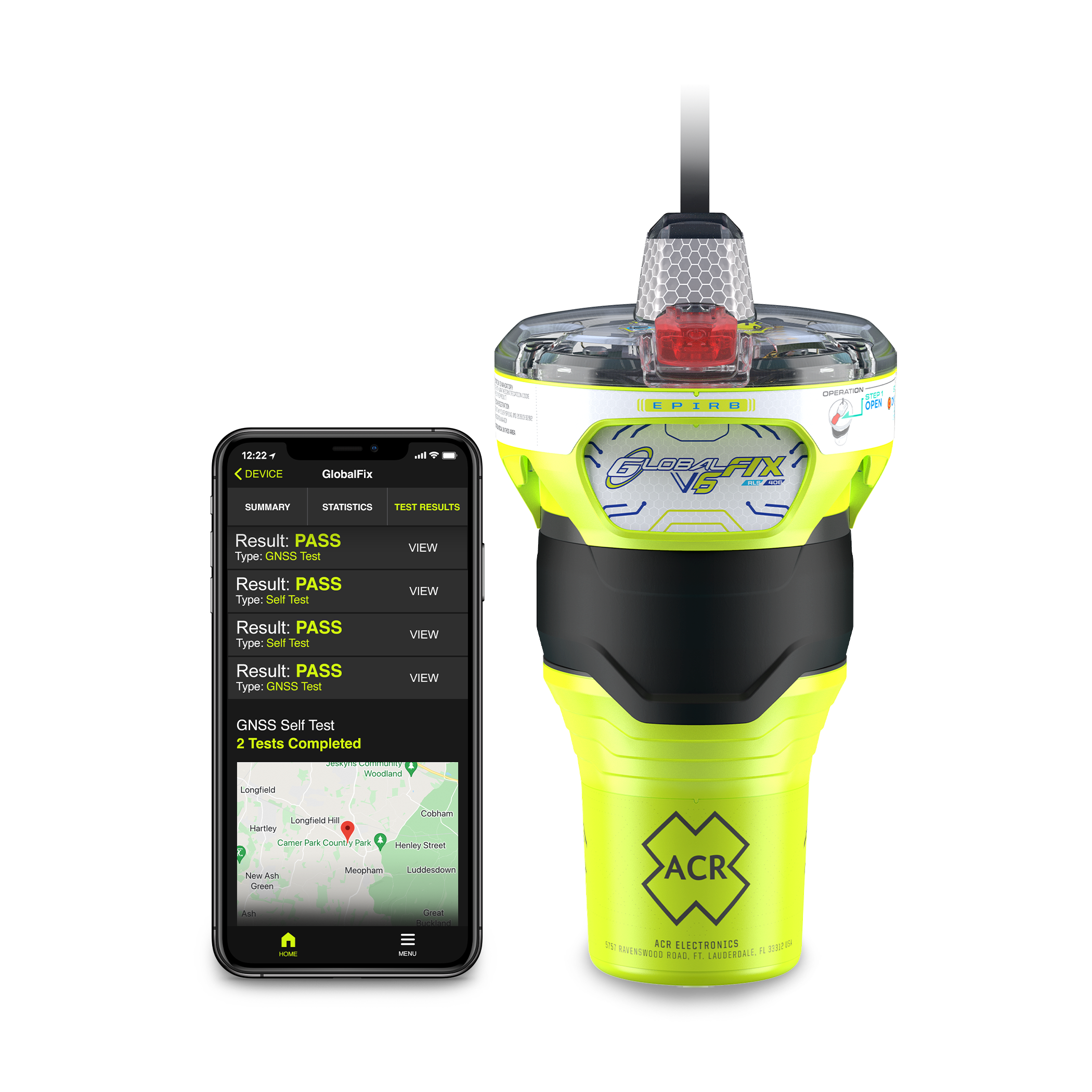 Using ACR’s free smartphone app and NFC (Near Field Communication) technology users can easily access EPIRB diagnostics. Placing a smartphone adjacent to the GlobalFix V6 EPIRB opens the ACR Product App which shows EPIRB data. The app shows the current battery life of the beacon, the number of GNSS and self-tests completed, and the amount of time the EPIRB has been activated. Users can see detailed information on each self-test and GNSS test performed by the device. GNSS tests include a map view demonstrating where previous tests were performed, the date and time of the tests, how long it took the EPIRB to get a fix on the GNSS coordinates, the number of satellites used to obtain that fix, and the fix’s accuracy. NFC allows users to routinely check the status of all EPIRB functions to ensure it is working properly and ready to go in case of an emergency.