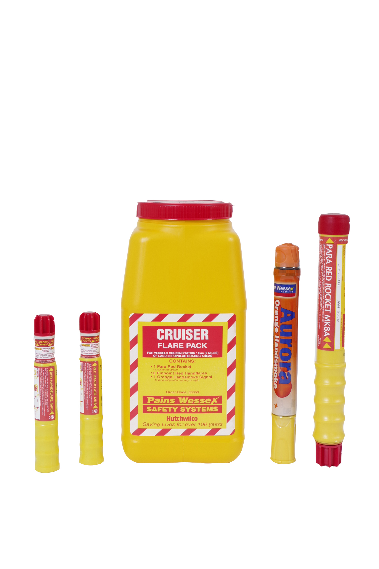 Contains: 1 x Para Red Rocket, 2 x Pinpoint Red Handflares, 1 x Orange Handsmoke Daytime Signal in a convienient Floating Flare Pack bottle