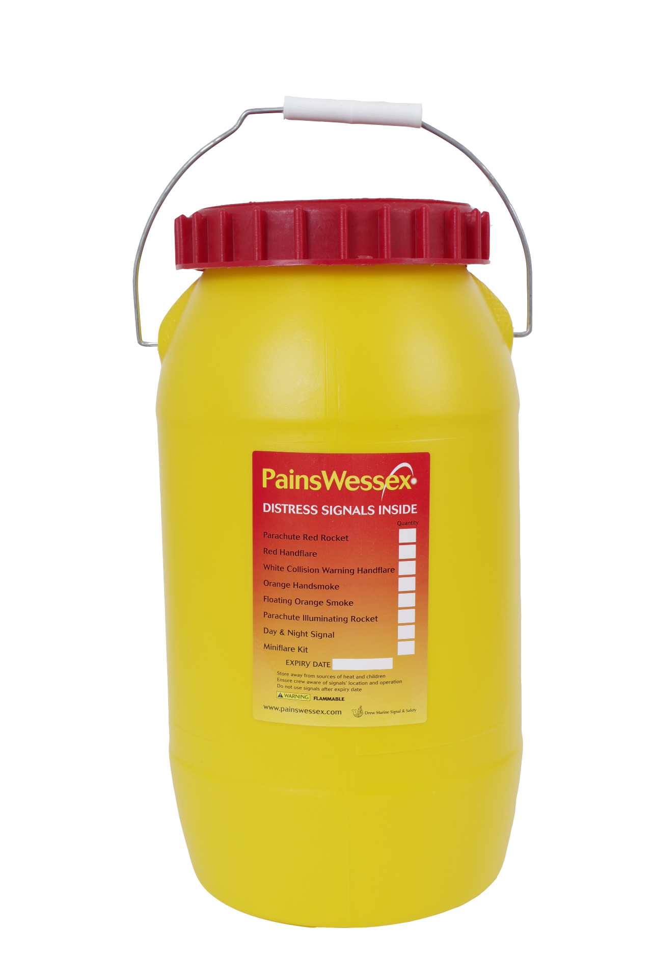 Rigid, watertight polythene container with 'O' ring seal screw top, rope handle for quick grabbing.
