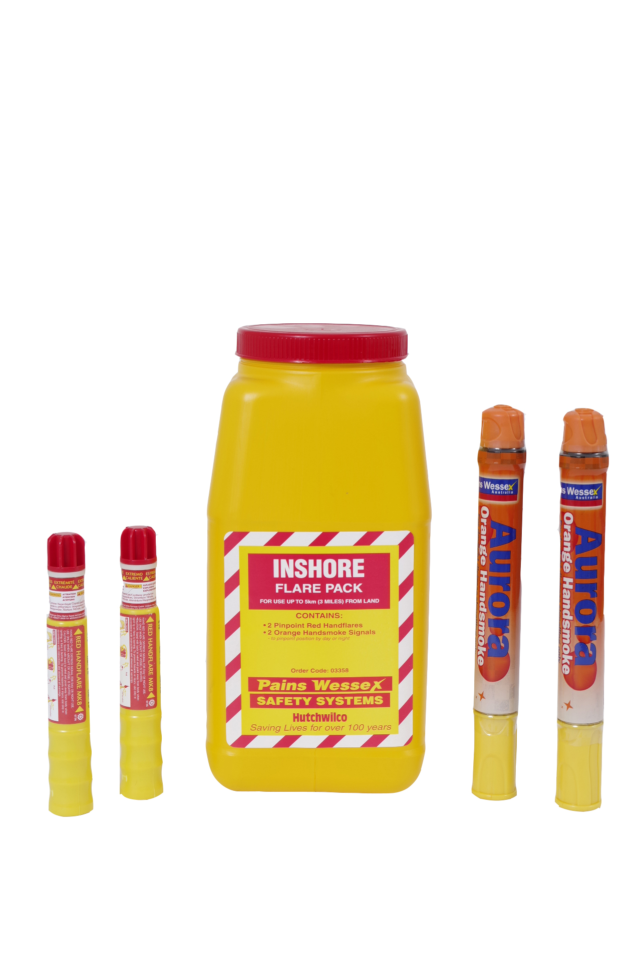 Cotains: 2 x pinpoint Red Handflares, 2 x Orange Handsmoke Daytime Signals in a convienient Floating Flare Pack bottle