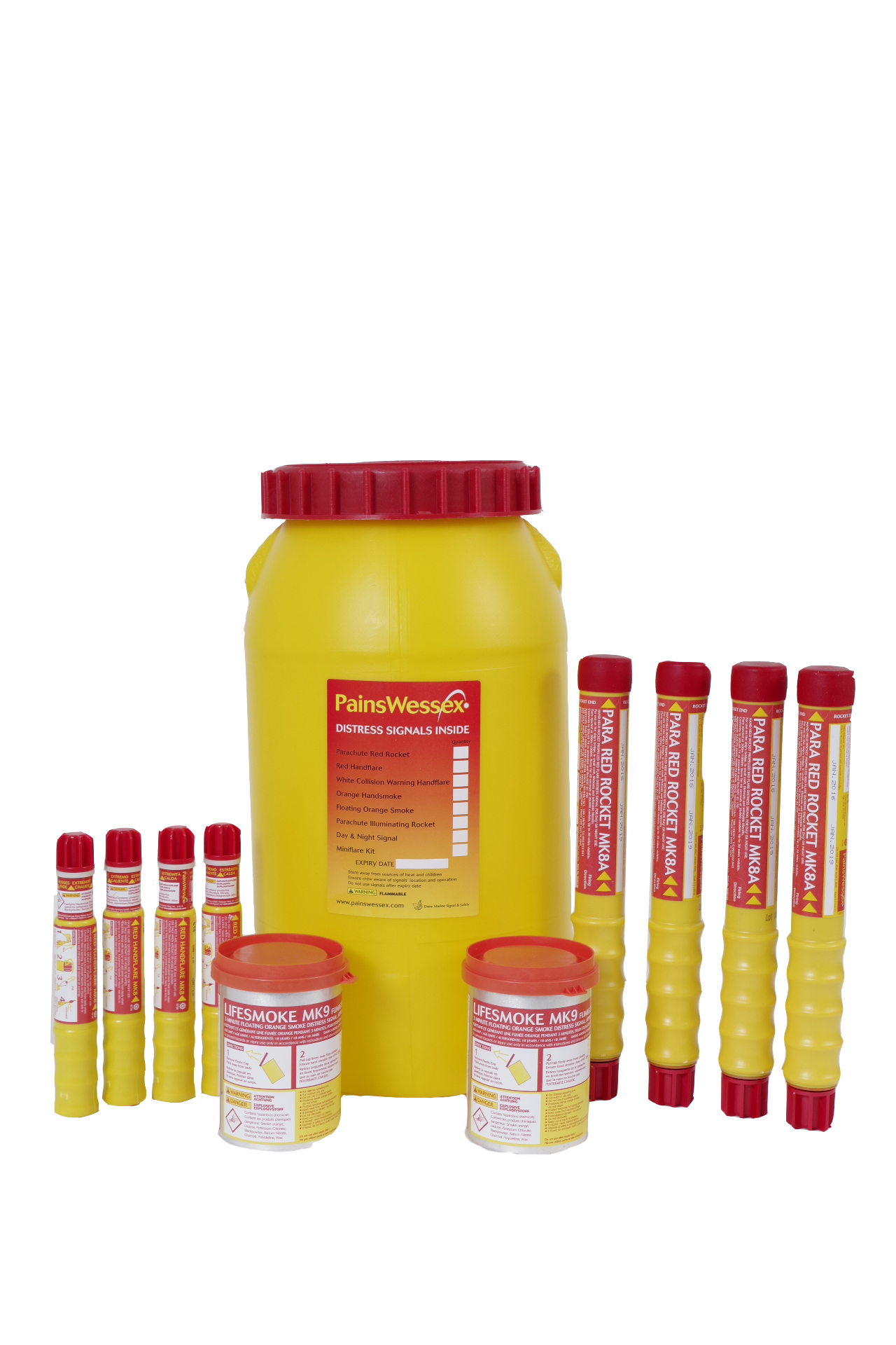 Conatins: 4 x Para Red Rockets, 4 x Pinpoint Red Handflares, 2 x Lifesmoke Buoyant Orange Smoke Signals in a robust, waterproof Flare Polybottle, with 'O' ring seal screw top. Conforms to SOLAS/Ship Wheel - *Please note flare polybottle might differ from image