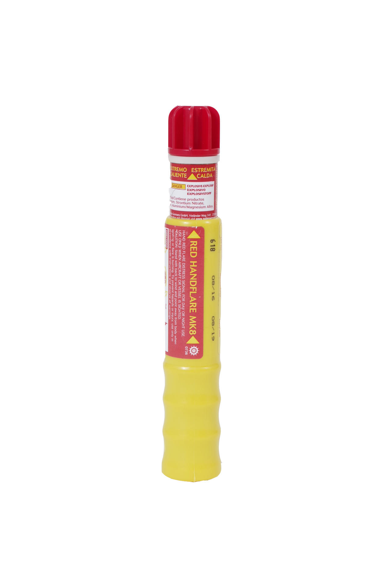 A hand-held red flare, designed to use in short-range signalling situations incorporating a unique pull-twist-strike firing mechanism, it can easily be activated with one hand, or by hands that are cold and wet.