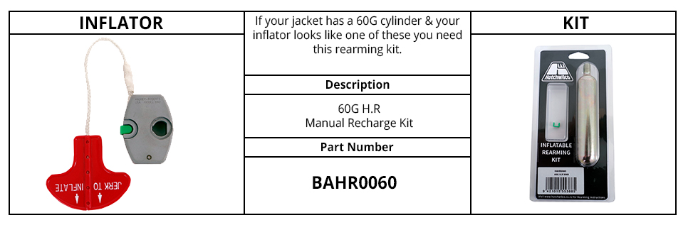 Rearming kit for the 275 Manual Inflatable. Contains Co² Cylinder 60g, a Green Tamper Clip