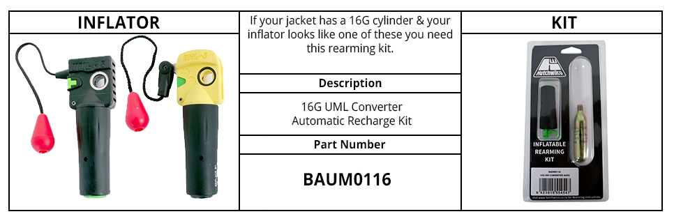 Rearming kit for the UML Converter Automatic Inflatables with a 16g Co² Cylinder. Contains Co² Cylinder 16g and also replacement UML Converter Sensor Auto cartridge.