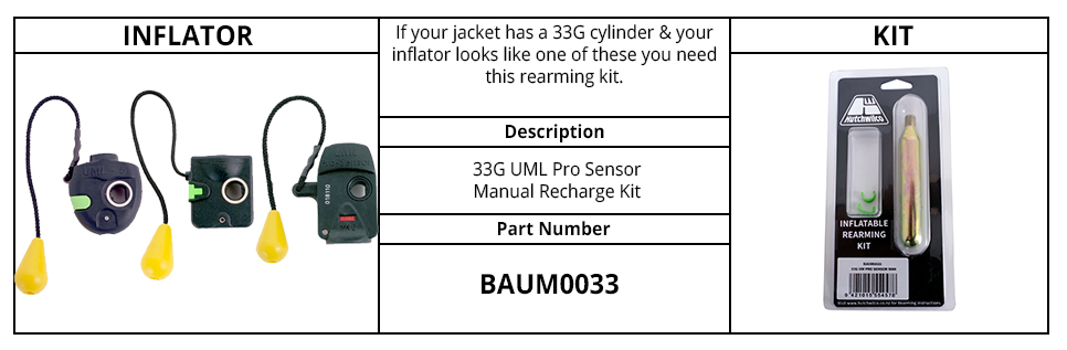 Rearming kit for the UML Pro Sensor Inflatables with a 33g Co² Cylinder. Contains Co² Cylinder 33g and rearming clips