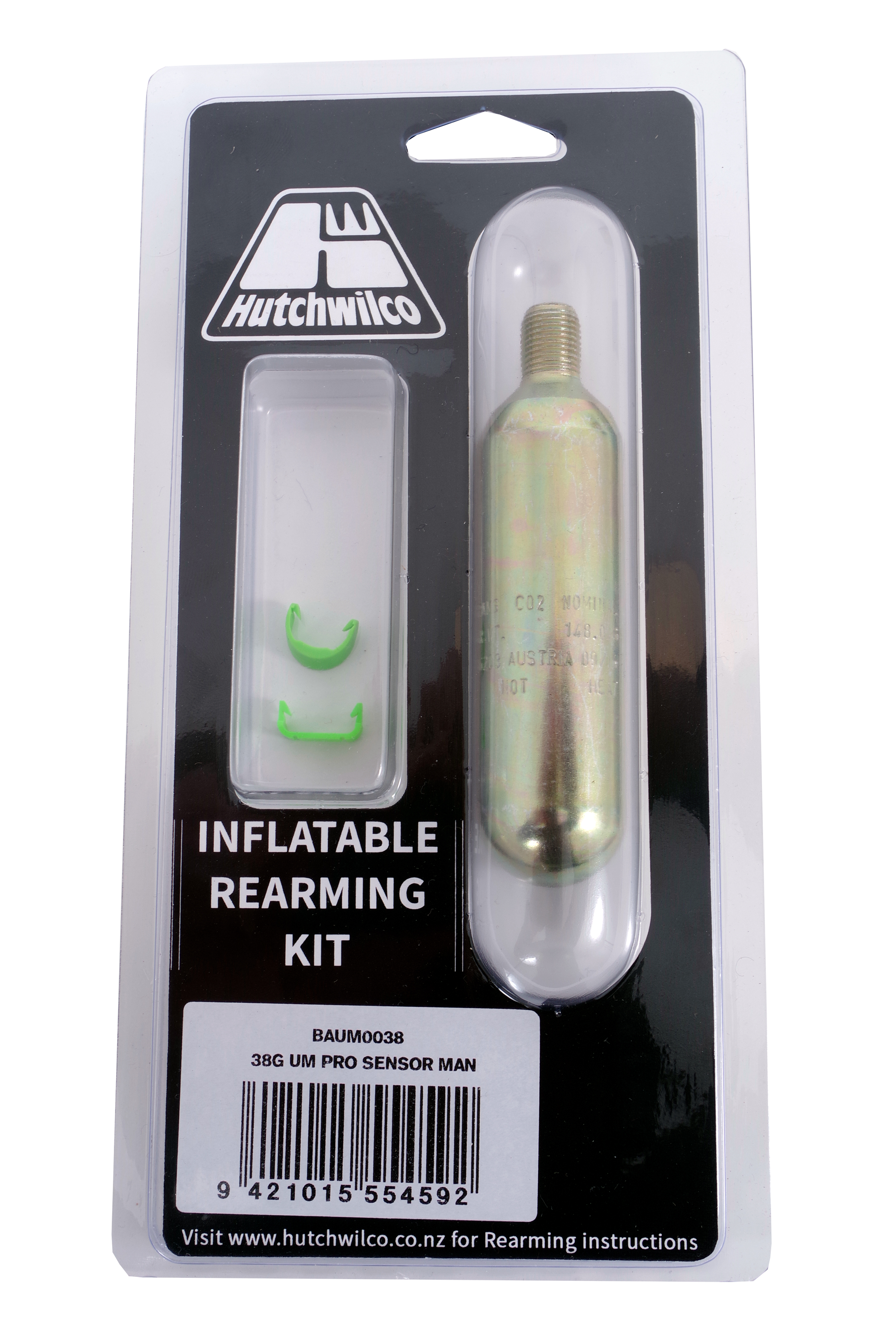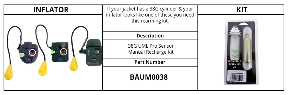 Rearming kit for the UML Pro Sensor Inflatables with a 38g Co² Cylinder. Contains Co² Cylinder 38g and rearming clips