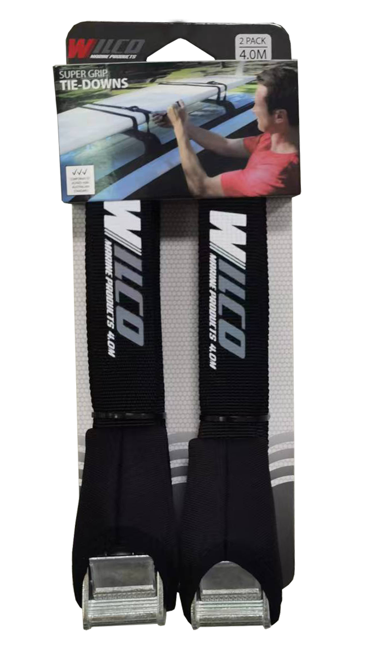 Versatile all purpose camlock tie-downs ideal for securing surfboards, paddleboards, kayaks etc to roof-racks or securing trailer loads. Heavy duty 1.85mm polyester webbing with up 300kg of breaking strain, Width 25mm, Length 2m. Neoprene camlock guard to avoid any damage to vehicle paintwork. Great value for money in 2 lengths - 2m and 4m